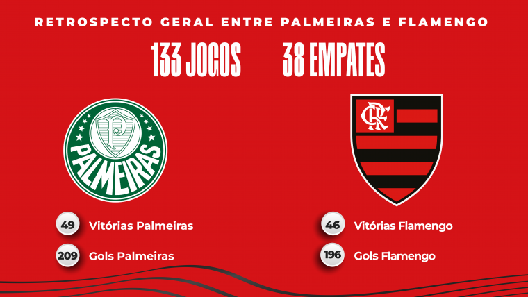 Confira abaixo o retrospecto geral do confronto entre Palmeiras e Flamengo na história: Veja as últimas notícias do Mengão no FLAPRESS: