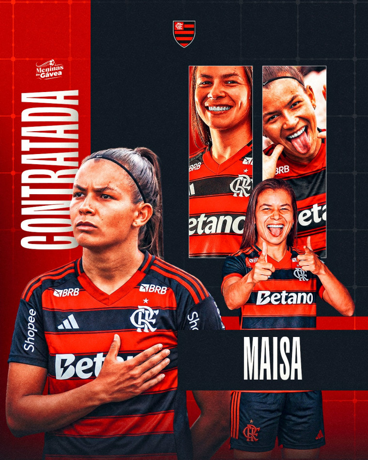 O Flamengo anunciou nesta quinta-feira (8) a primeira contratação do futebol feminino para a temporada de 2026. Trata-se da lateral-esquerda Maisa, que estava no América-MG. A atleta de 23 anos chega para reforçar o elenco rubro-negro nas disputas da Copa Rio, Campeonato Brasileiro, Copa do Brasil e Campeonato Carioca.