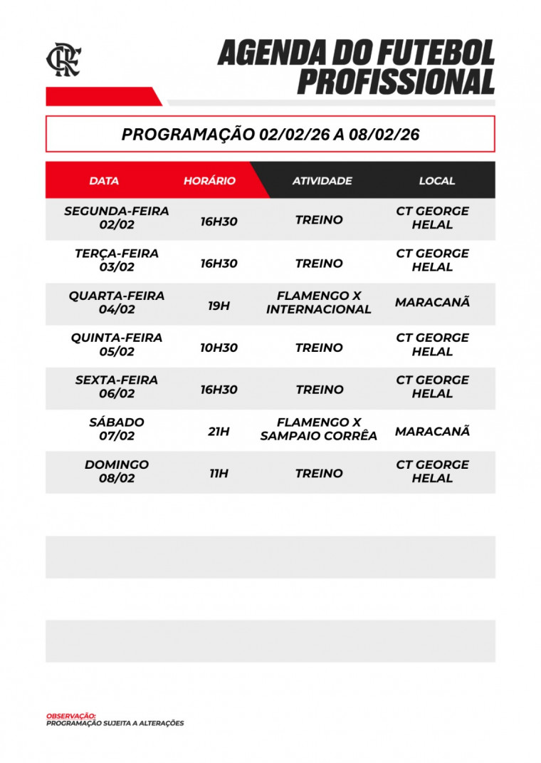 Agenda do futebol profissional (02/02/26 a 08/02/26) Por Comunicação Flamengo - em 01/02/2026 às 21:08