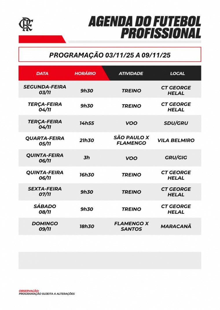 Agenda do futebol profissional (03/11 a 09/11)