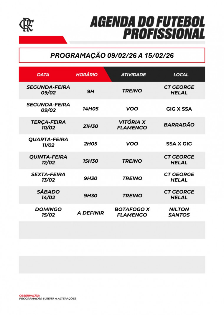 Agenda do futebol profissional (09/02/26 a 15/02/26) Por Comunicação Flamengo - em 09/02/2026 às 10:42