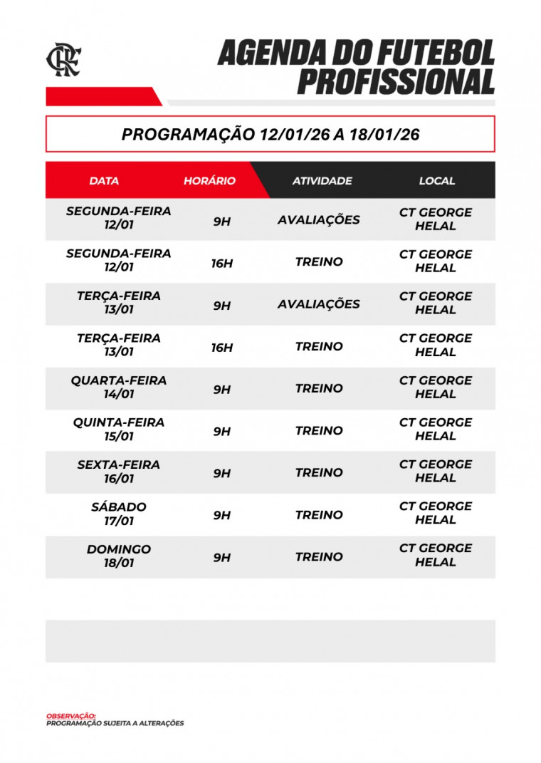 Agenda do futebol profissional (12/01/26 a 18/01/26) Por Comunicação Flamengo - em 12/01/2026 às 16:57