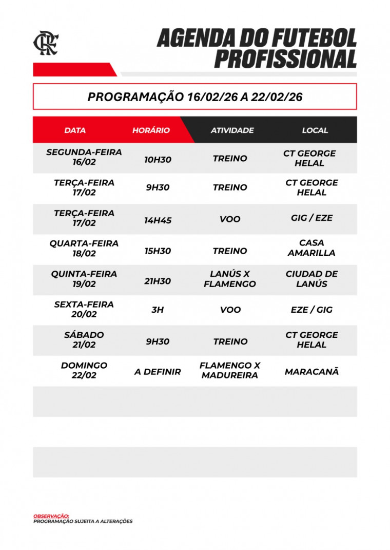Agenda do futebol profissional (16/02/26 a 22/02/26) Por Comunicação Flamengo - em 16/02/2026 às 10:18