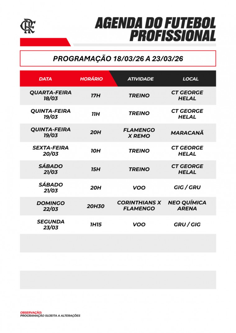Agenda do futebol profissional (18/03/26 a 23/03/26) Por Comunicação Flamengo - em 20/03/2026 às 18:32