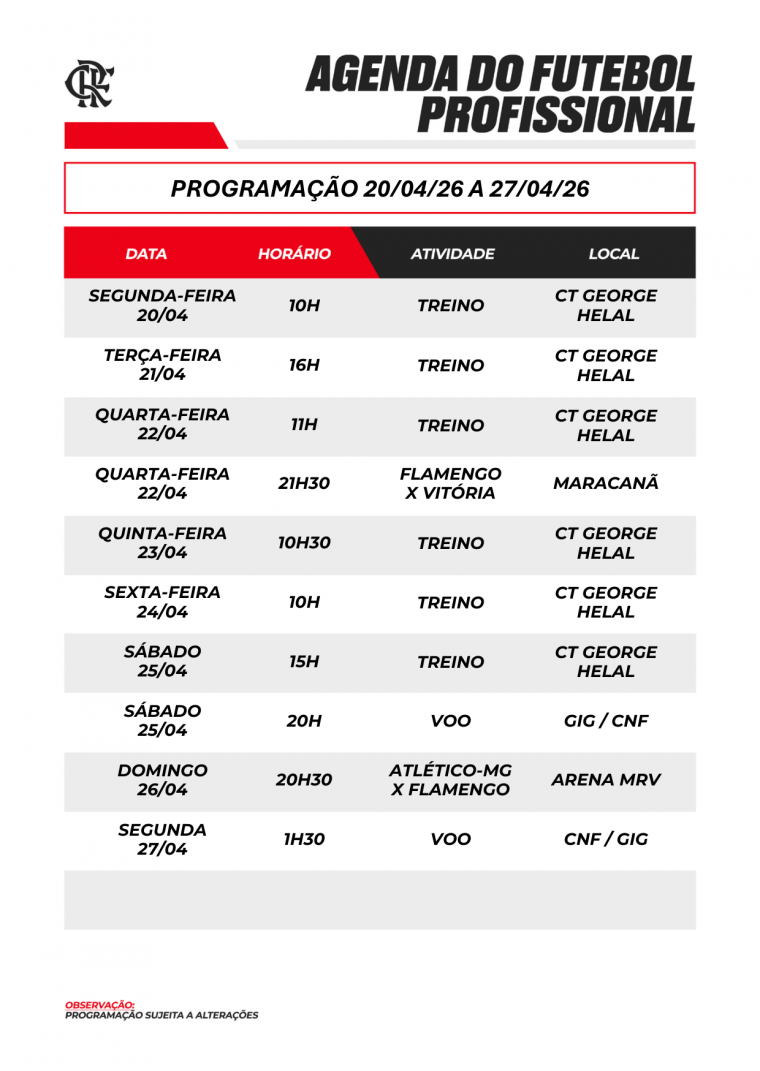 Agenda do futebol profissional (20/04/26 a 27/04/26) Por Comunicação Futebol - em 19/04/2026 às 22:33