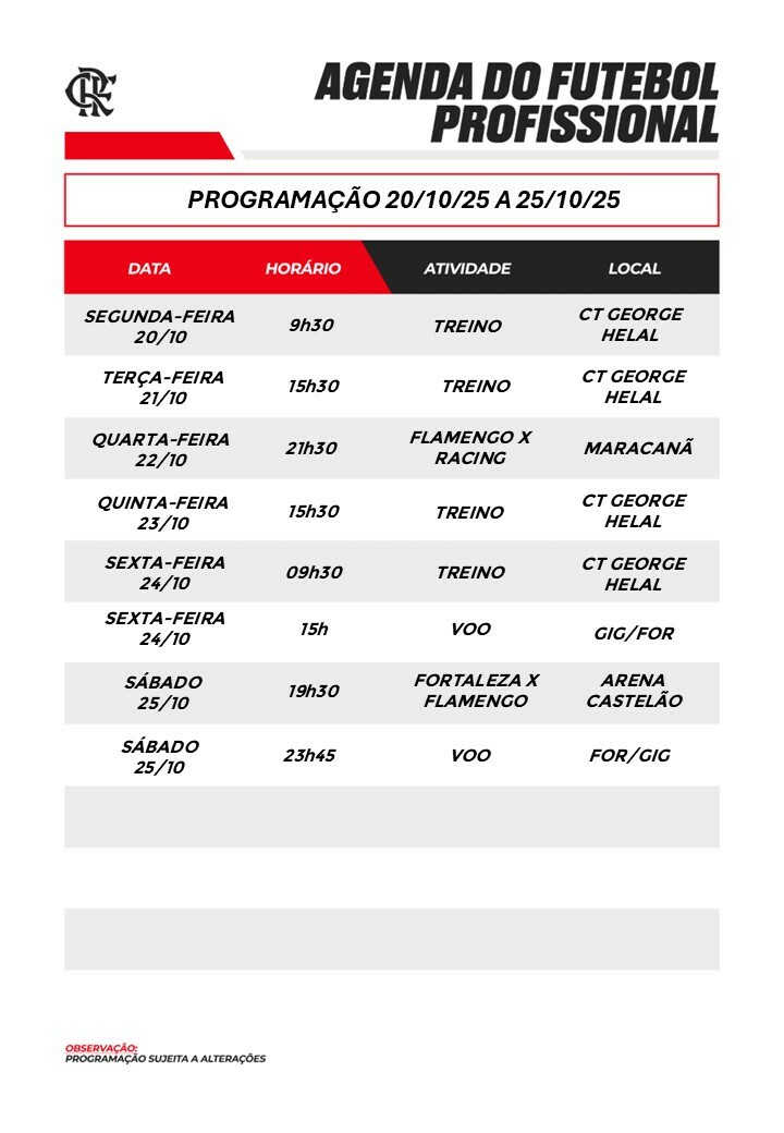 Agenda do futebol profissional (20/10 a 25/10)