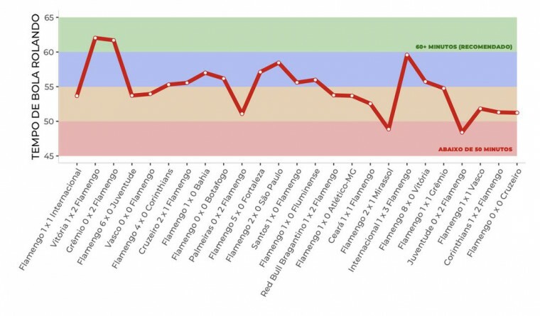 A recomendação internacional é de pelo menos 60 minutos de bola em jogo. Mas, na prática, a maioria dos jogos recentes do Flamengo têm ficado bem abaixo desse índice. O gráfico evidencia a tendência: se no início da competição o clube registrava números próximos da média esperada, hoje a realidade é de jogos travados, com interrupções constantes e pouco futebol.