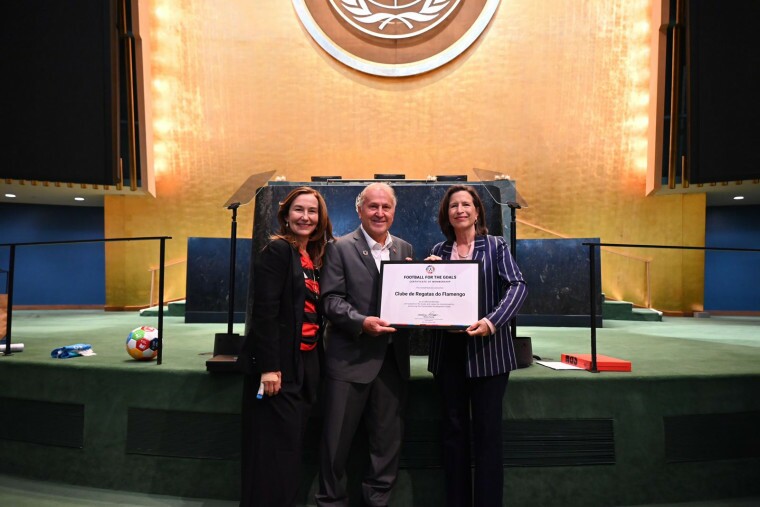 No encontro, no salão da Assembleia Geral, Zico e o Flamengo, representado por sua diretora de Comunicação, Flavia da Justa, receberam o certificado do programa Football for the Goals. Na ocasião, Melissa Fleming anunciou Zico como novo ‘Campeão’ da iniciativa e fez a entrega o cachecol oficial, símbolo concedido aos embaixadores do programa. O craque, primeiro brasileiro a receber a honraria, passa a integrar um seleto grupo de personalidades do futebol que utiliza suas plataformas para inspirar torcedores e a comunidade do esporte, além de promover questões ambientais e de direitos humanos.