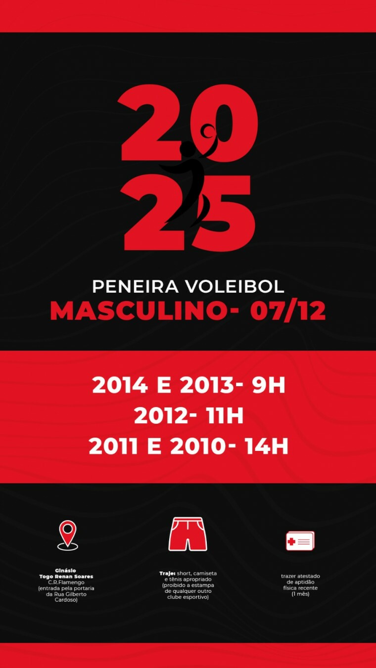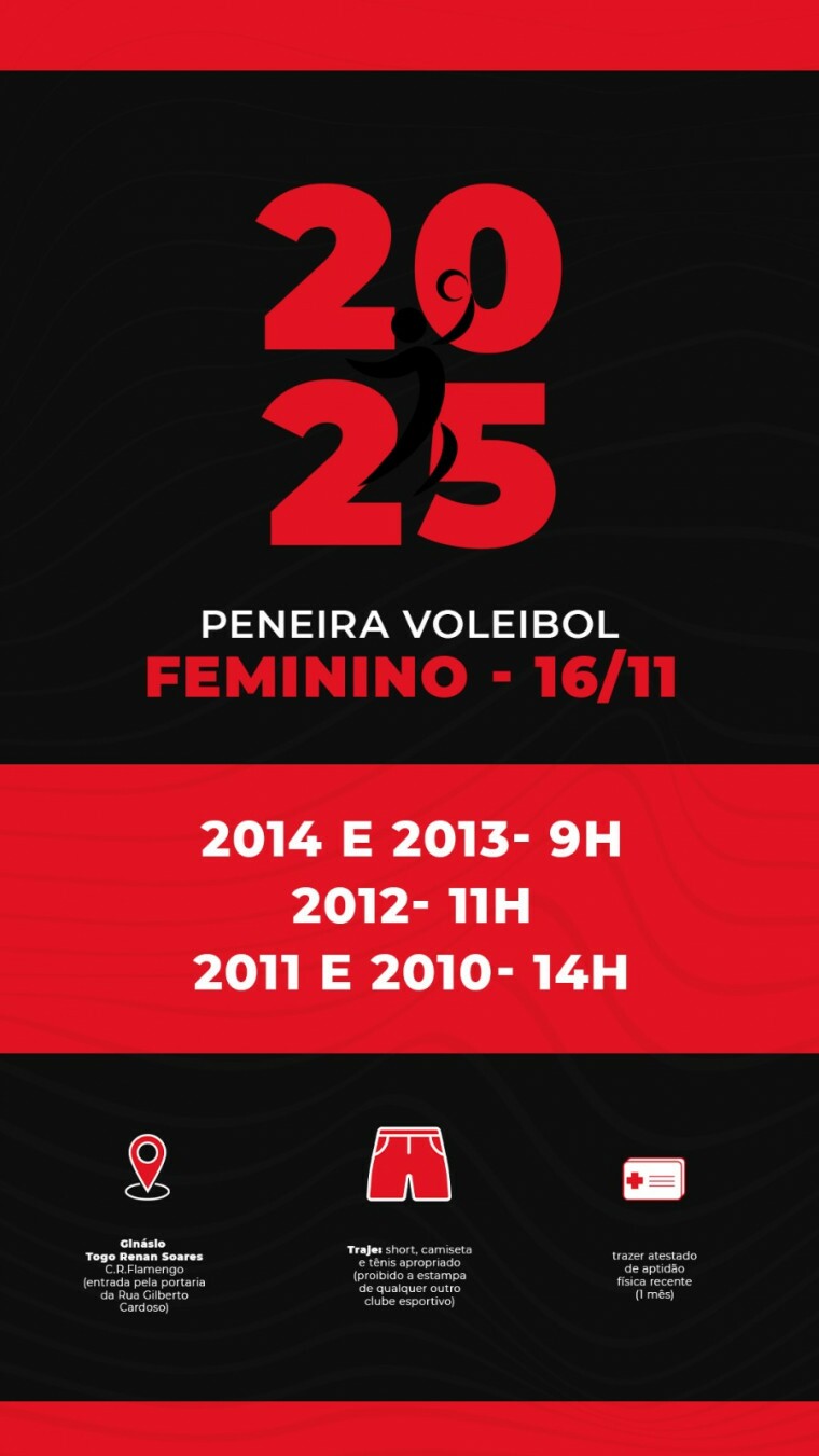 Por Leonardo Pimenta - emSonha em jogar vôlei pelo Mengão? Então participe da próxima seletiva da modalidade! Em novembro, no dia 16 (para o time feminino) e em dezembro no dia 07 (para o time masculino). Serão realizadas as peneiras do vôlei do Flamengo, no ginásio Togo Renan Soares, na sede da Gávea. A entrada deverá ser feita pela portaria da Rua Gilberto Cardoso, em frente ao Selva de Pedra.
